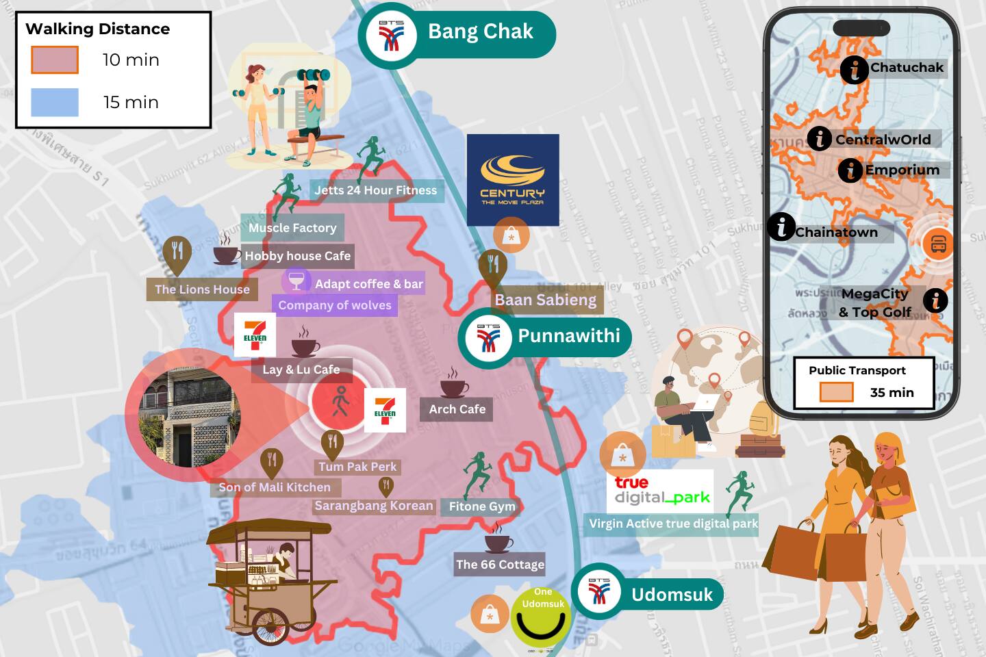 Getting Around Punnawithi Navigating Bangkok from our Punnawithi location is convenient and straightforward, with excellent connectivity through multiple transport options. Walking: The neighborhood is pedestrian-friendly with plenty of street food vendors, cafes, and local shops within walking distance. The Skywalk system makes it particularly safe and comfortable to walk to major destinations. Public Transport Options BTS Skytrain: The Punnawithi BTS station is just 6 -10 minutes walk away, connected via a covered Skywalk that leads directly to True Digital Park. This safe and convenient walkway keeps you protected from both traffic and weather while providing easy access to central Bangkok within 15 minutes. Canal Boats: A unique feature of the area is the Phra Khanong canal with long-tail boat service, offering a scenic alternative for daily commutes. The boat pier is accessible near the property, providing a peaceful way to explore the waterways of Bangkok. Taxi and Ride-Sharing Services Recommended Services: Bolt (primary recommendation based on cost and sometimes better cars) Grab (secondary option - higher availability and cost) Local motorbike taxis (available at Sukhumvit soi 64) Private Transport: For airport transfers or special occasions, we can arrange luxury taxi service - just let us know in advance. Rush Hours: Plan ahead during peak hours (7-9 AM and 4-7 PM). The BTS Skytrain is often the most efficient option during these times. Important Note When using ride-hailing apps or giving directions to taxi drivers, mention True Digital Park as a landmark - it's well-known in the area and helps ensure accurate navigation to our location. Drivers will also be able to find Soi Sukhumvit 64.